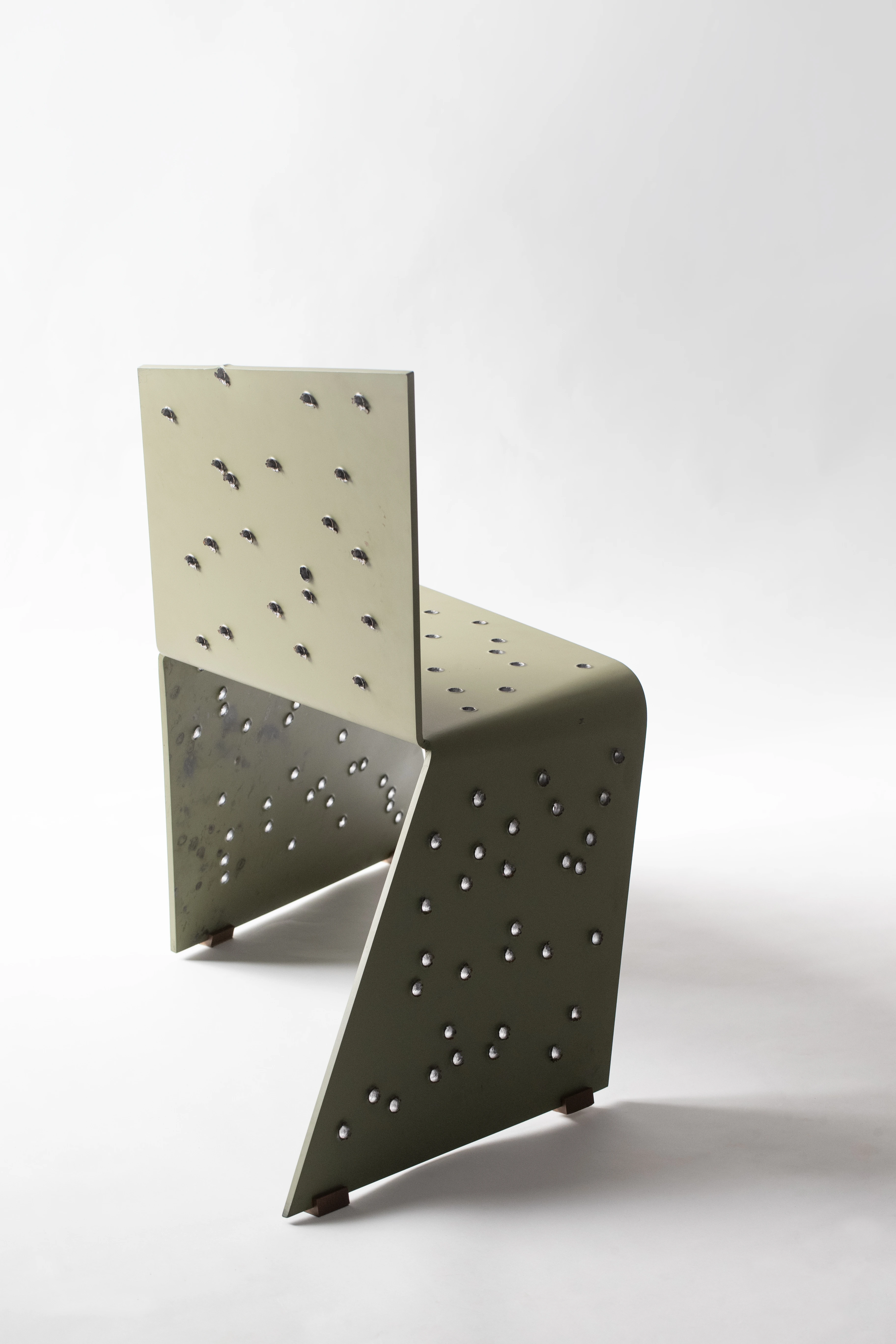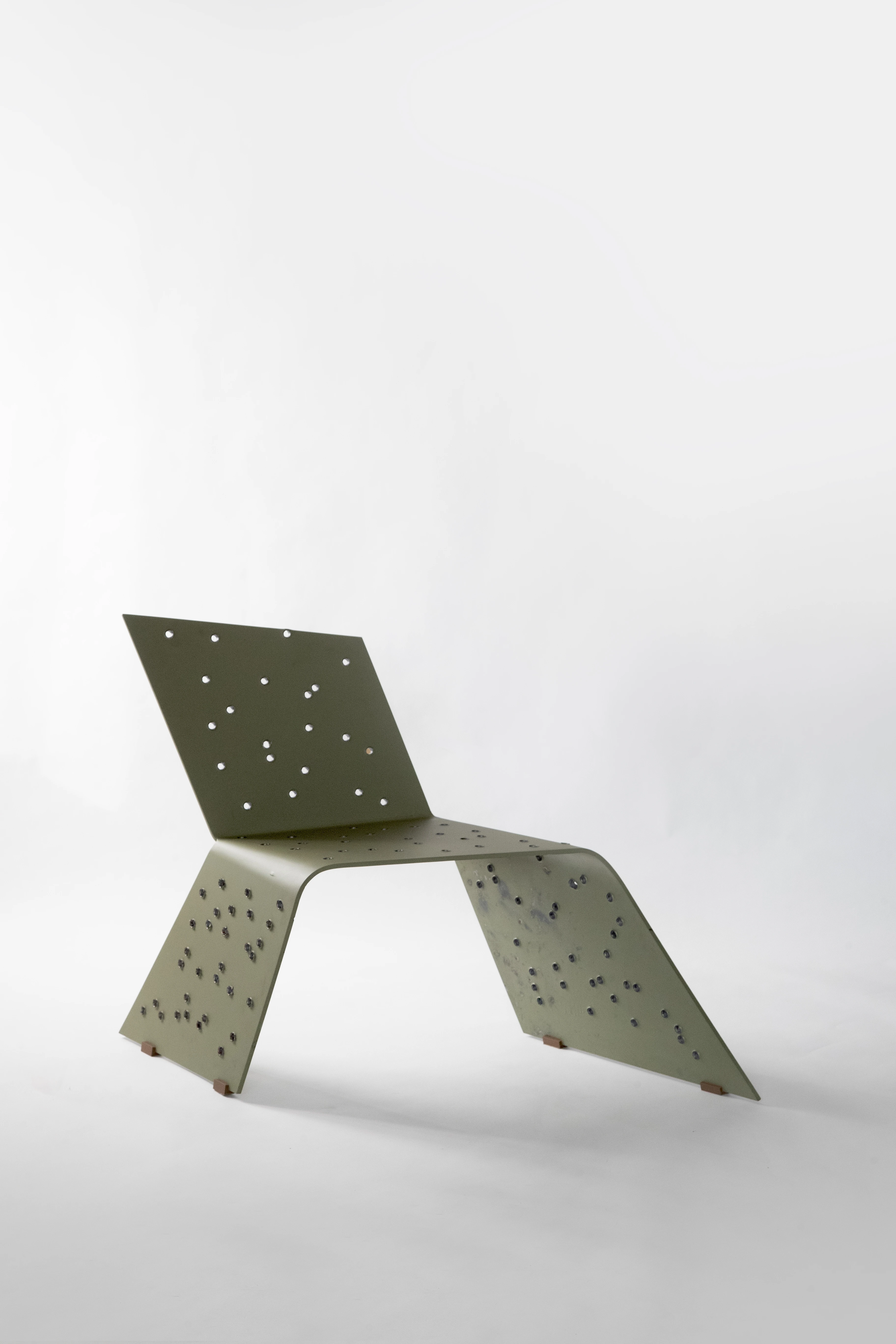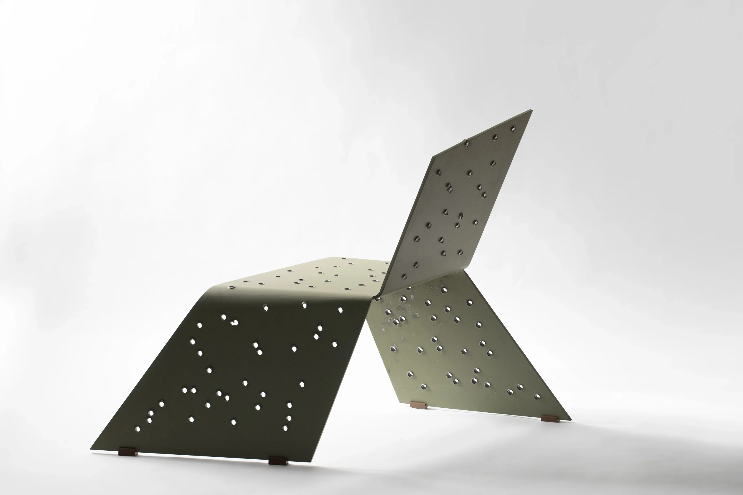 The chair consists of four interconnected planes: the seat, the backrest, and two legs. These planes are deformed parallelepipeds. The legs and backrest, which rise and fall from the seat plane, respectively, perform asymmetrical vertical and horizontal movements. One leg extends backward, while the other extends forward. The planes of the legs deform in such a way that the viewer perceives the chair as moving. The backrest also deforms, further enhancing the chair’s mobile, anthropomorphic character. This creates a tension between the familiar expectation of furniture and the dynamic, animated perception of the object, projecting a sense of life and strength while remaining structurally sound.