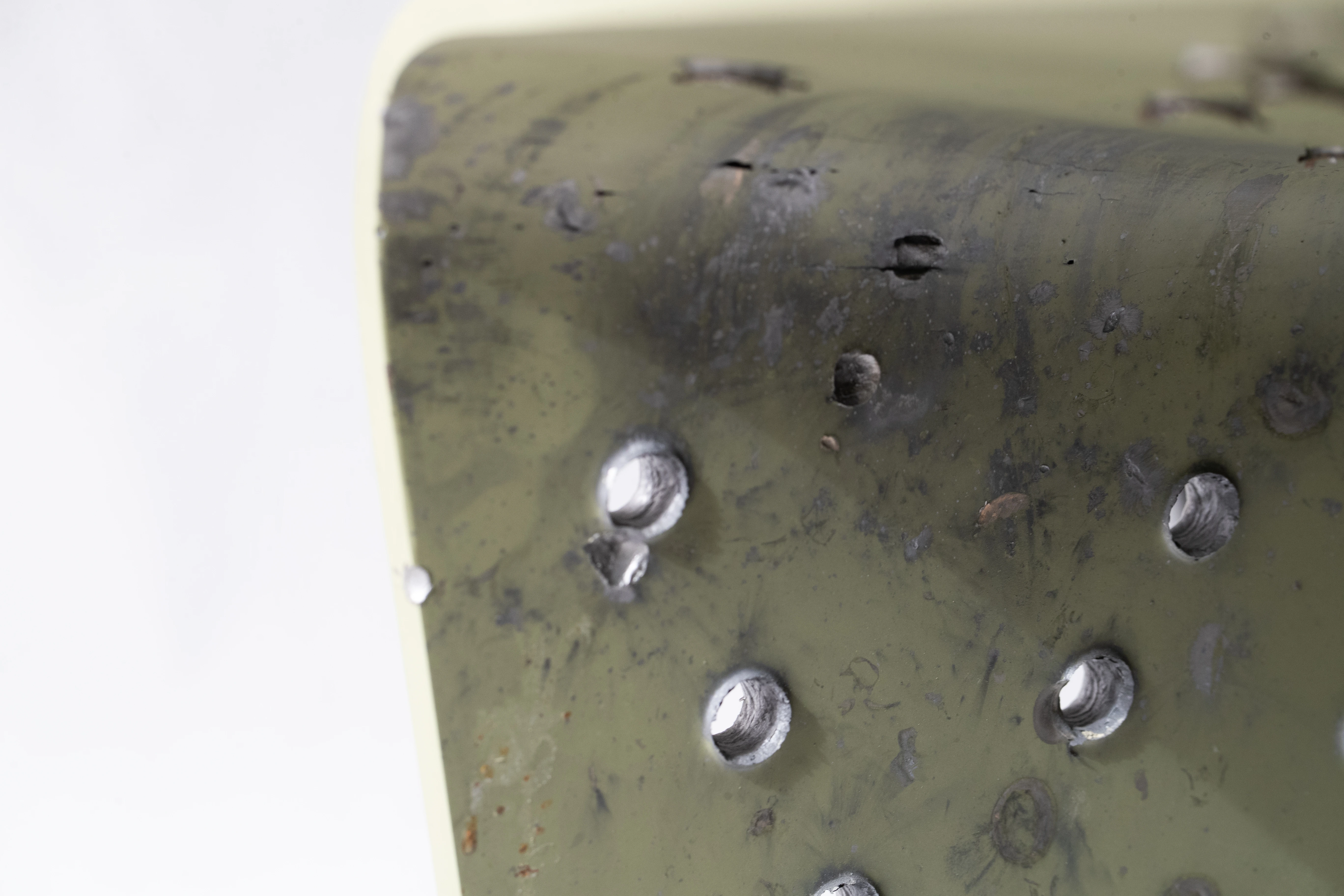 Finish: All surfaces are professionally treated and painted. Bullet holes in the seat and backrest are