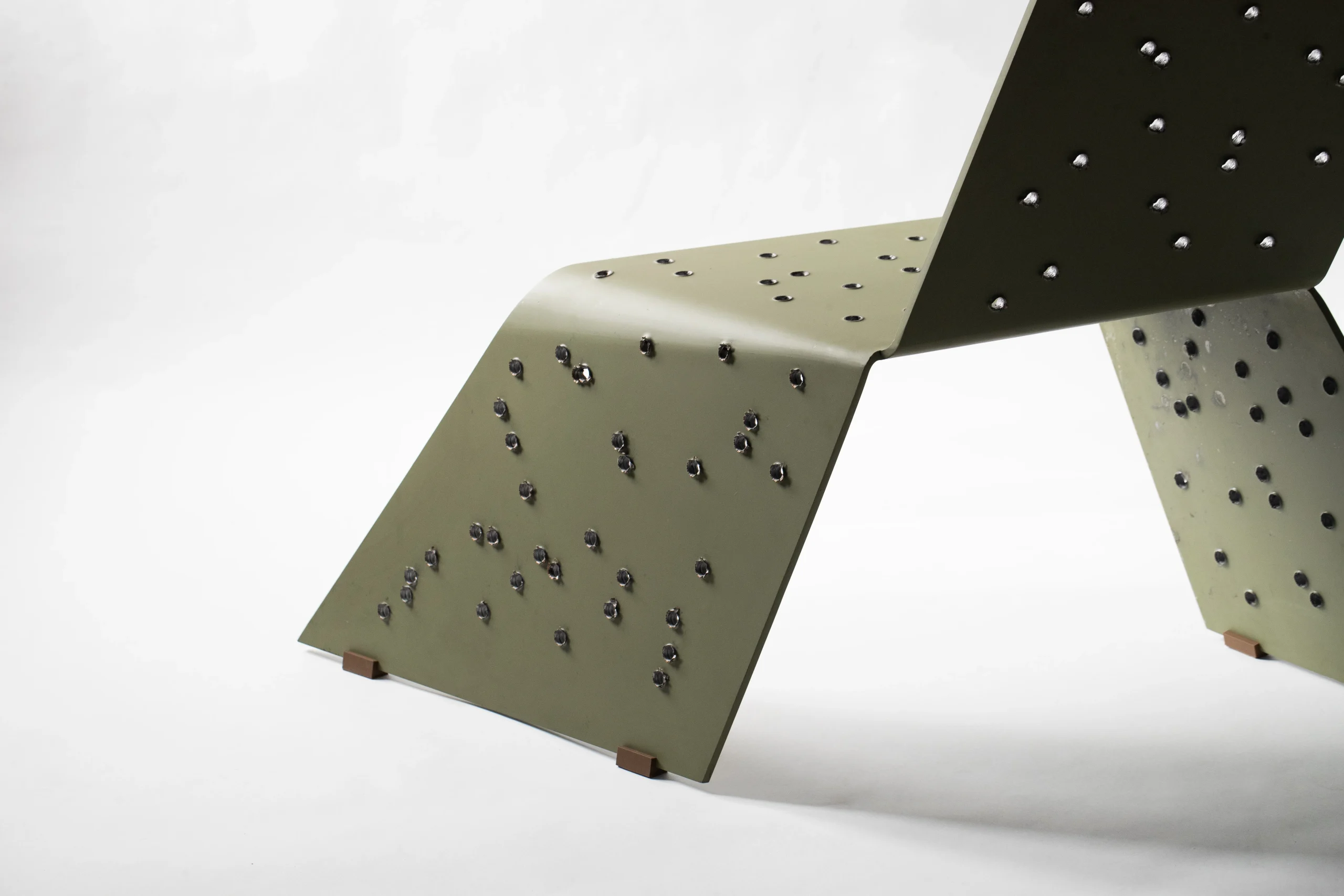 Despite its scars, the form leans forward, symbolizing persistence and the drive toward a goal. The chair calls upon viewers to treat one another with caution, empathy, and respect, acknowledging that every person carries their own battles.